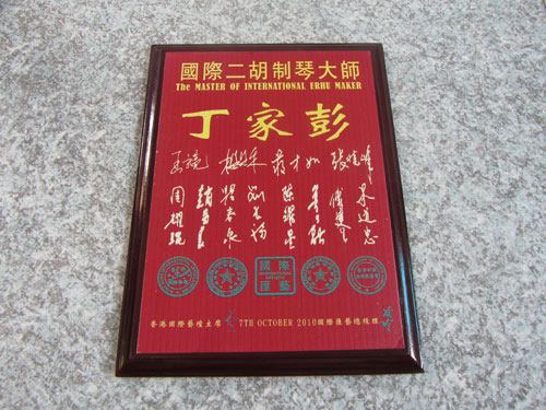 二胡制作大師丁家彭先生1949年出生樂器世家,17歲隨其祖父學琴藝,并深得精髓,其聰穎好學,悉心鉆研與 探求二胡制作,博得同行的欽佩贊許,更得了許多知名演奏家的稱贊,充分認識到二胡制作每個環節,都對二胡制作都有影響力,因此對二胡的選材,選料,蟒皮都十分嚴格,二胡整體穩定性良好,環境干擾影響極小。